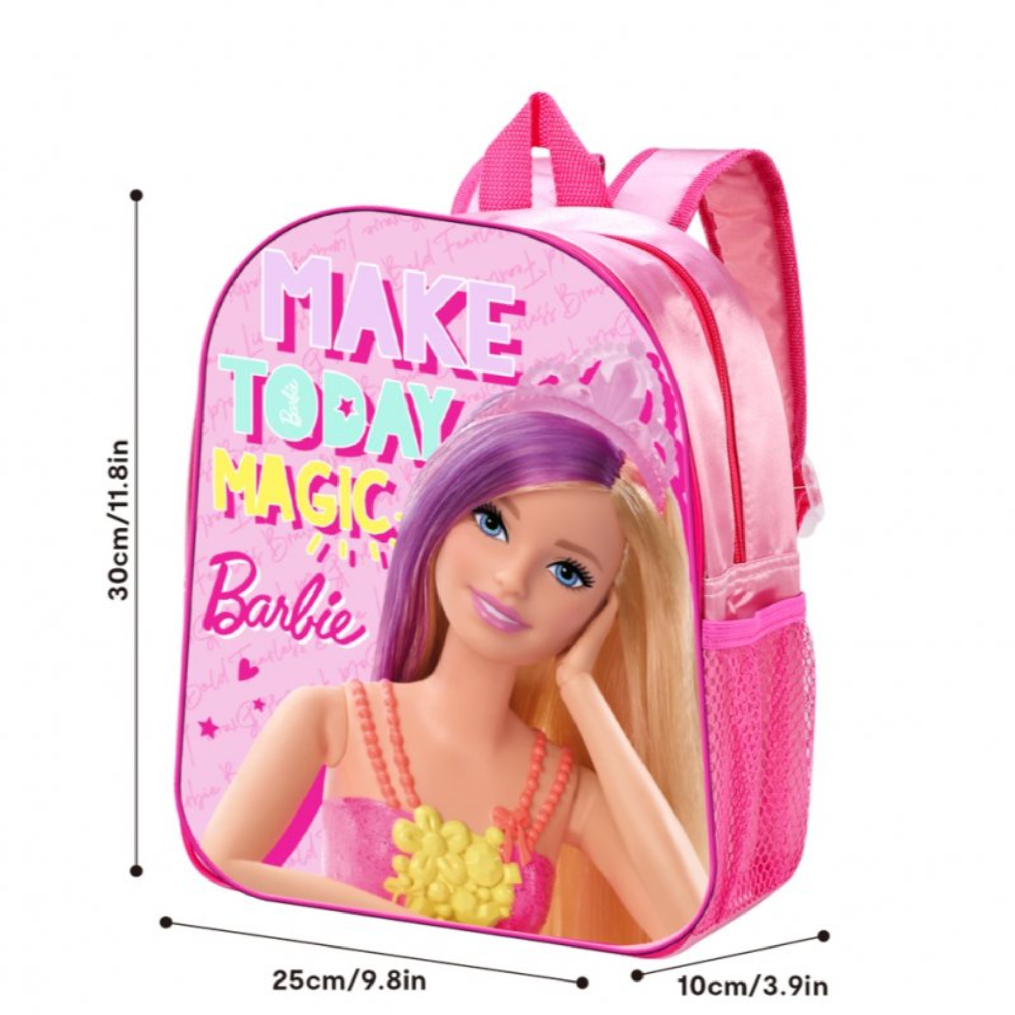 This impressive new junior backpack has new and improved easy adjustable strengthen padded shoulder straps and carrying handle with a zipper into the main compartment. The backpack has a side mesh pocket and featuring a large image of Barbie.